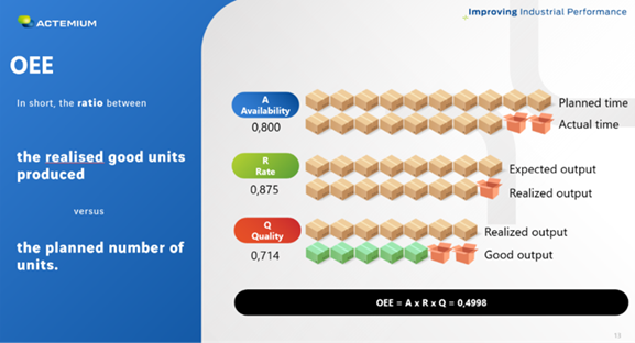 OEE (Overall Equipment Effectiveness) drukt uit welk deel van je theoretisch mogelijke output je als goed product realiseert. Het is het resultaat van deze drie componenten: